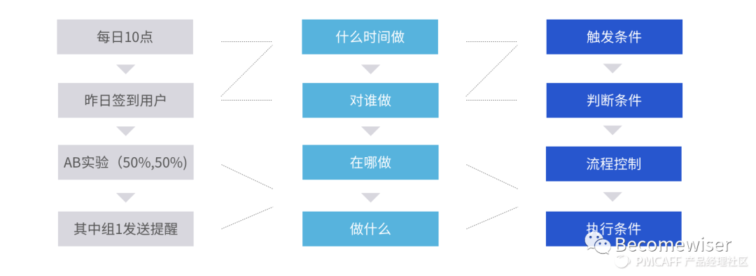 什么时间做和对谁做是触发条件,对谁做在实时事件触发的场景,例如用户签到立即下发奖品,这种情况事件即是触发条件又是判断条件的一部分。