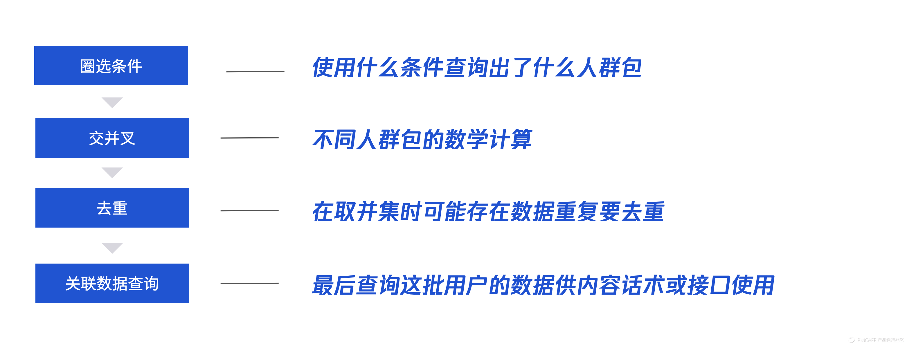 这是在可视化、自助化选择用户条件后,通过与其取值范围进行比较经计算生成人群数据包的一种形式。