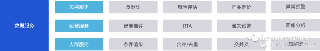 数据服务,这个词广义的说数据的采集、处理、管理都是一种服务。在这里特指的是供给实际运营的服务,例如:人群服务、风控服务、运营服务。