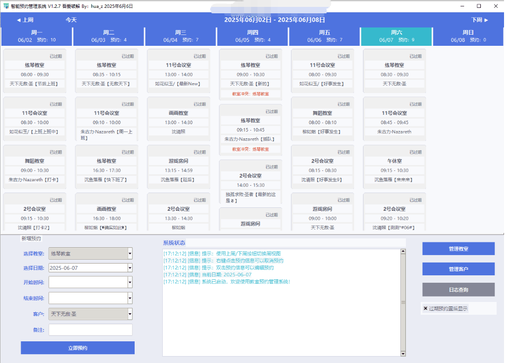 主要功能:1,教室管理/客户管理,取消,修改预约信息,以及日志的查询;