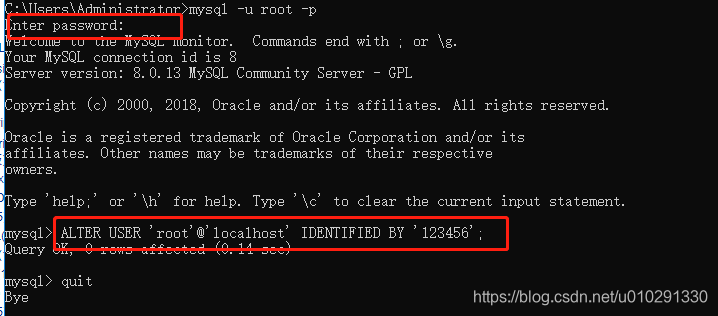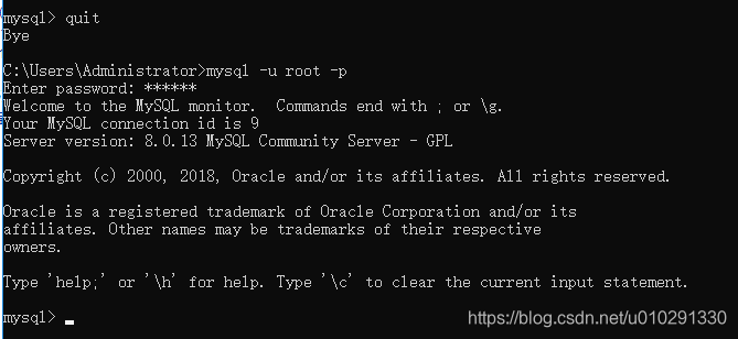 输入quit,退出当前登录,输入登录命令:mysql -u root -p