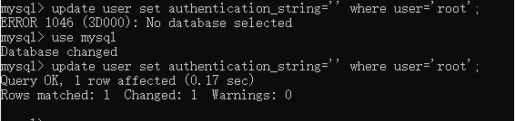 update user set authentication_string='' where user='root';(必须置为空,不要写其他密码,后面才是更改密码)