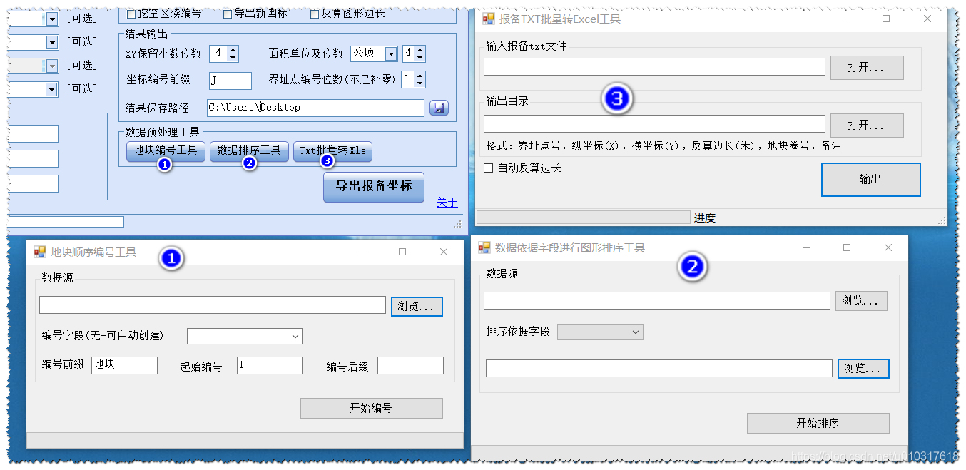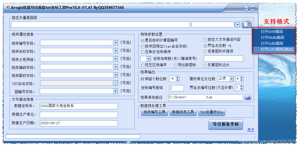 二、软件基本功能:工具实现了arcgis常用格式SHP,Mdb、Gdb面图层批量导出土地报备坐标,地块用途、地块名称等字段可以手动自定义,也可以从图层属性表中读取!对于挖空(扣洞)地块,软件会自动按照规范(地块圈号来区分)进行处理。可以导出一个总的txt,也可以导出分地块、分项目名称单个txt。