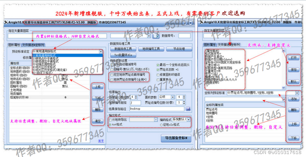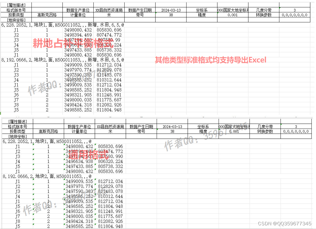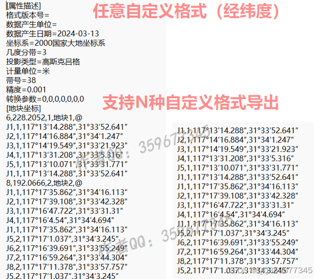 软件新架构,自定义化程度高,旗舰版除以上内置标准格式(除包含通用格式外,还包括设施农用地报备、耕地占补平衡报备、耕地进出平衡报备、成片区开发方案、征地Excel报备格式)外,属性项支持自定义,调整顺序,删除等操作;坐标列项也支持调整顺序,删除操作;可以自行设定;自由组合后,还可衍生出N种自定义格式出来(这种灵活性意味着,您可以根据自己的需求,组合出无数种独特的自定义格式);