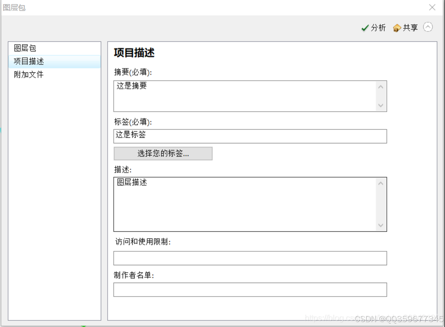 为项目描述中必要的字段填写一些简单内容,填写完毕后点击【分析】按钮,若出现错误提示,则按照提示修改错误项,直至没有错误出现,此时点击【分享】按钮生成图层包。