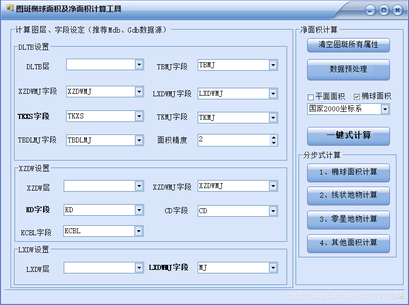 对数据要求很低,DLTB层至少需要TKXS字段;XZDW至少需要KD字段;LXDW至少需要MJ字段。建议放到数据Mdb或Gdb数据库,可以单独计算图层的椭球面积,可以分步骤计算,也可以一键计算,比较人性化。