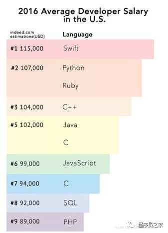 在由Indeed.com创建并由codementor.io发布的2016年开发人员薪水研究中,发现Python开发人员的平均工资是107,000美元:基于这项研究,Swift,Python,Ruby,C ++和Java将让你赚更多的钱(PHP垫底)。考虑到移动应用程序的货币化,也许Swift高居榜首并不奇怪,因为它通常用于开发iOS和macOS应用程序。但Swift下面紧随其后就是Python和Ruby:前五个中只有两种脚本语言。虽然Ruby是一种通用编程语言,适用于许多应用程序,但是当轮询一组Ruby开发人员时,会发现他们正在使用Ruby进行Web开发。