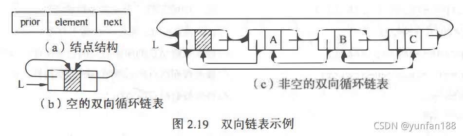 和单链表的循环链表类似,双向链表也可以有循环表,称为双向循环链表,一般简称为双向链表。如图 2.19(c) 所示,链表中存在有两个环,图 2.19(b) 所示为只有一个头结点的空表。