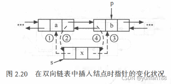 【算法思路】双向链表的插入操作,与单链表不同的是,它需要同时修改两个方向上的指针,如下图 2.20 显示了插入结点时指针修改的情况。在插入结点时,需要修改四个指针。时间复杂度为 O(n)。