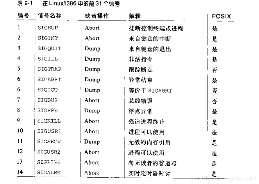 挂起信号:已发送但还没被接收的信号被称为挂起信号,任何时候一个进程仅存在给定类型的一个挂起信号,统一进程同样类型的其他信号不被排队,只被简单丢弃。