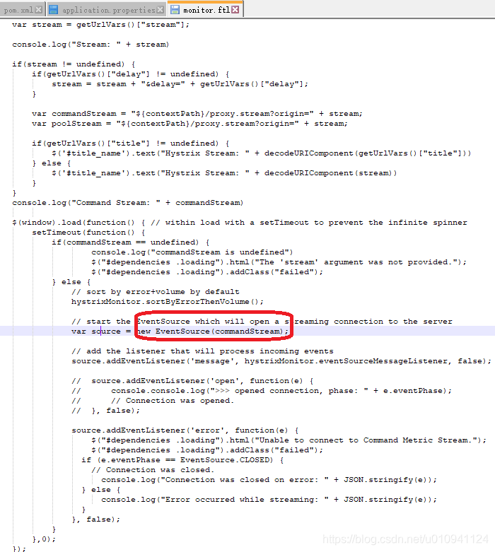 查阅HystrixDashboard的jar包的页面模板文件,它采用了HTML5的EventSource服务端推送机制实现数据刷新: