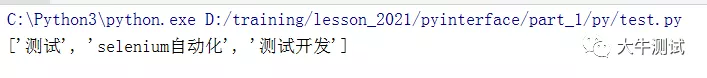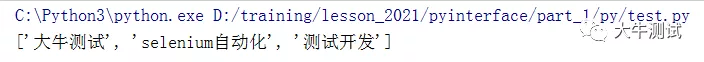 list = ['大牛测试','selenium自动化','测试开发'] print(list)运行后