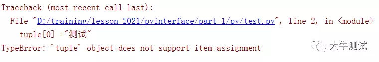 tuple = ('大牛测试','selenium自动化','测试开发') tuple[0] ="测试"执行后报错: