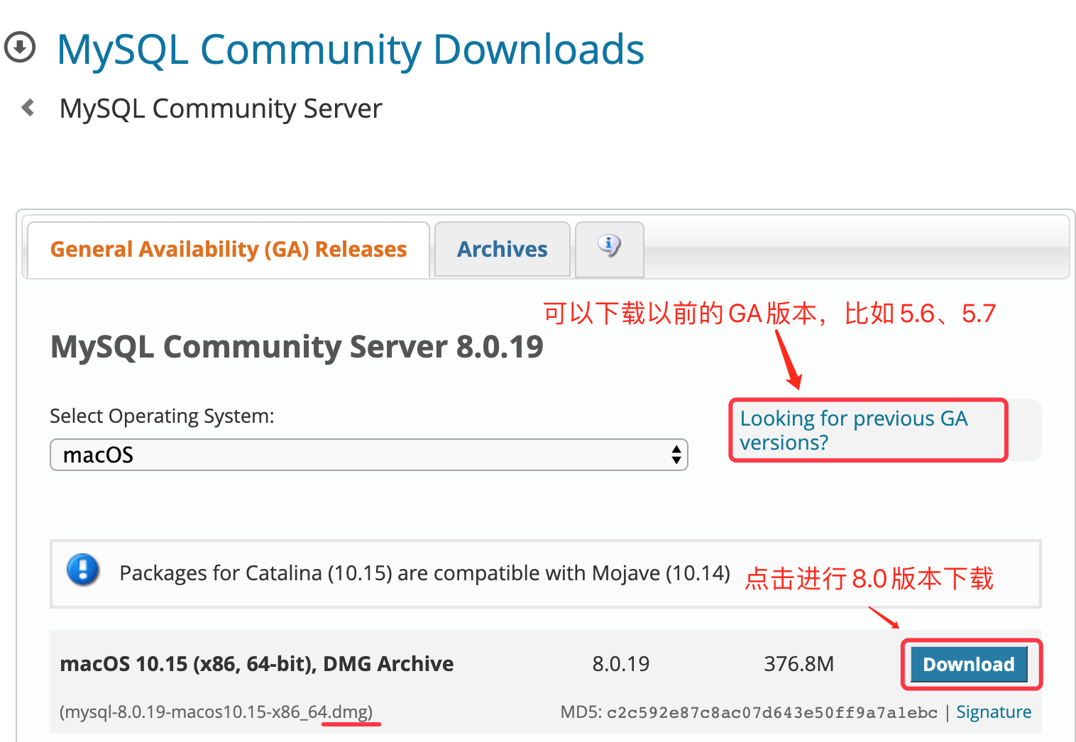 - 2.1 进入mysql安装包下载页面,下版本的dmg文件,下载地址如下:msyql官网下载地址