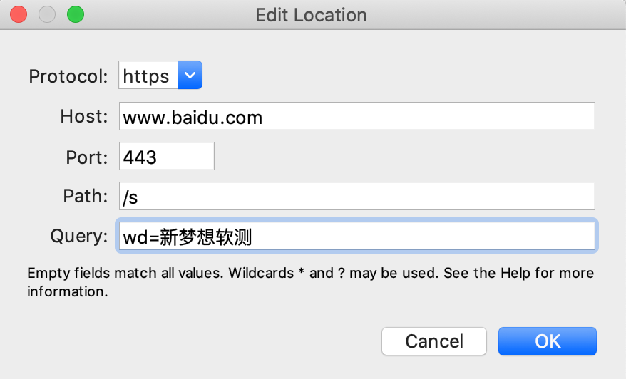 如上是针对 请求 https://www.baidu.com/s?wd=新梦想软测 该URL全部字段的填写