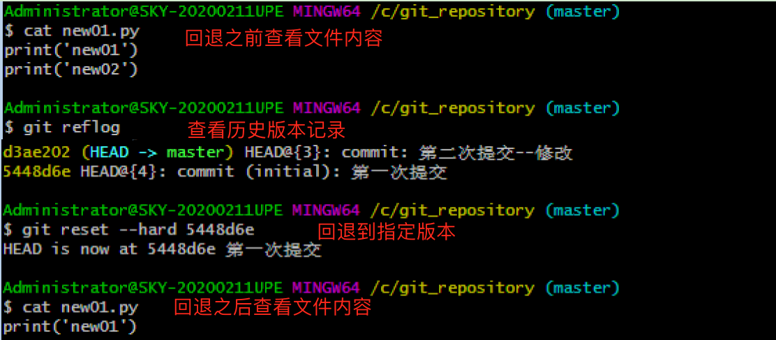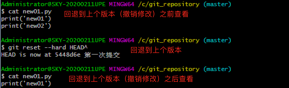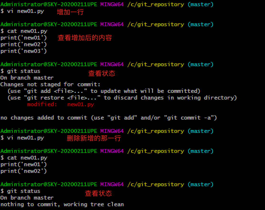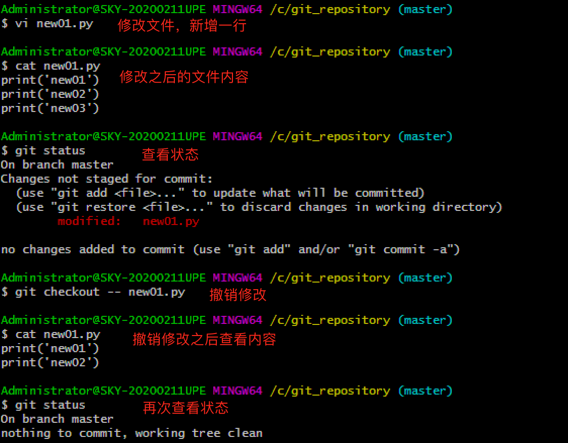 使用命令 git checkout -- new01.py,进行撤销操作,看下图,具体步骤不做描述