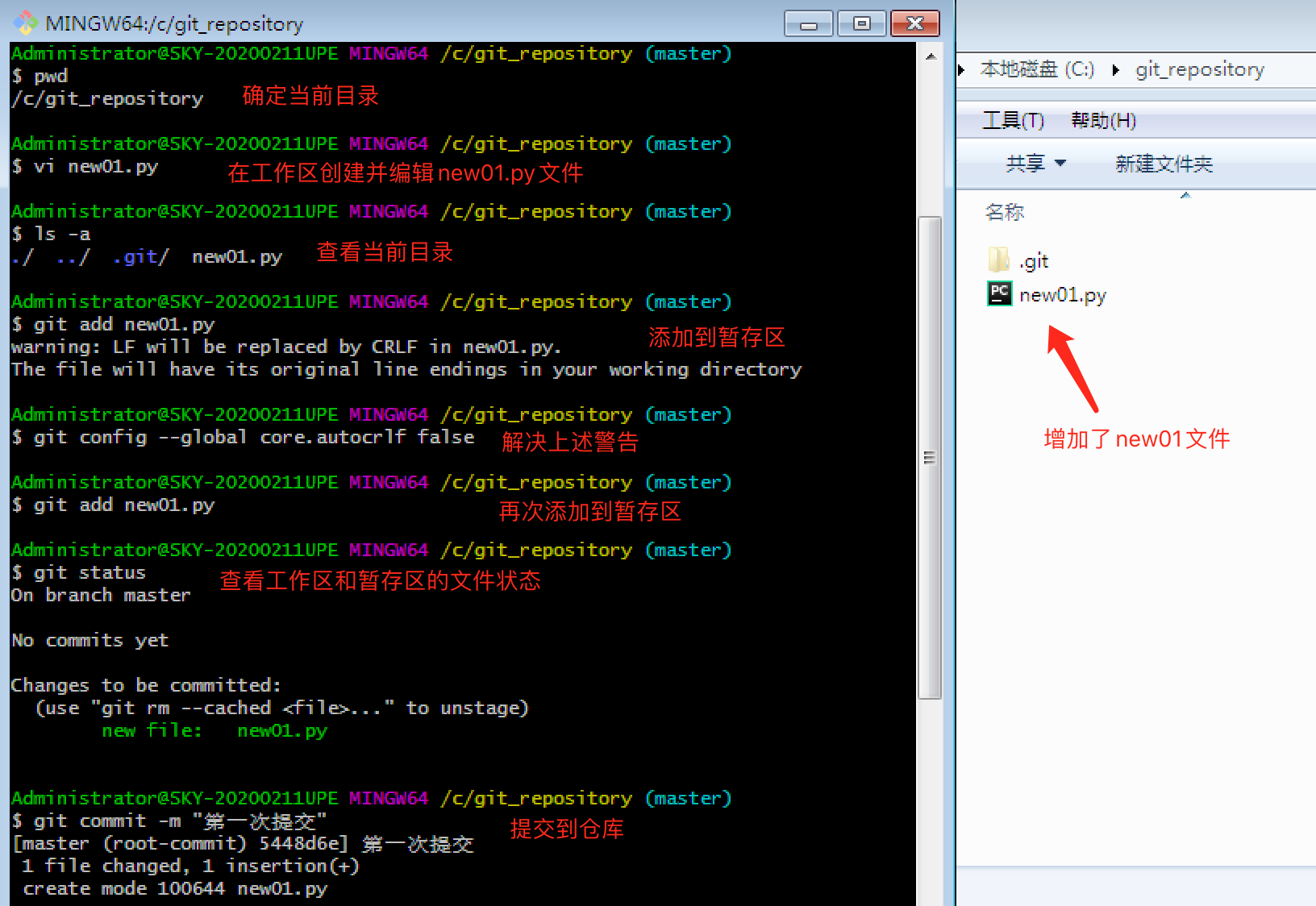 - 在工作区 c:\git_repository 下新建一个 new01.py 文件,内容为 print('new01')