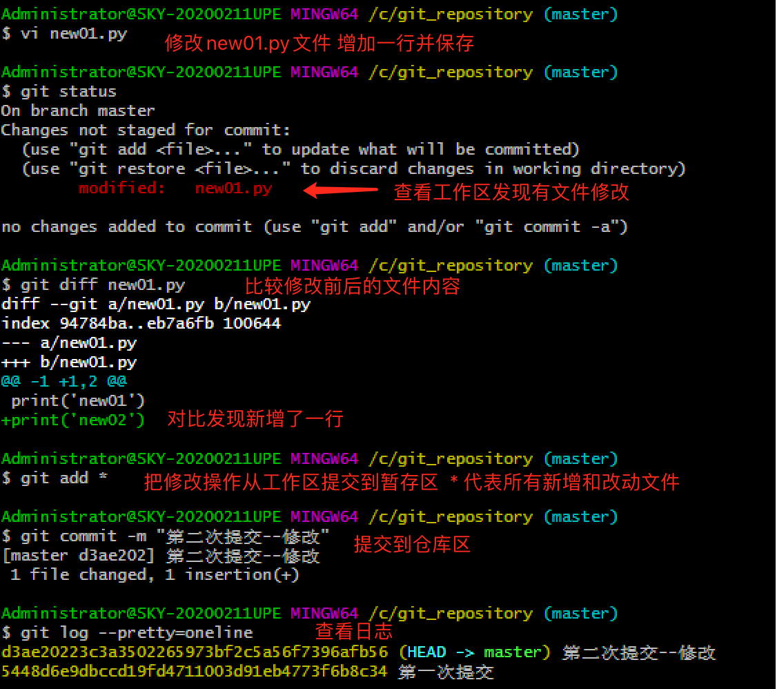 - 手动修改上面的 new01.py 文件,增加一行内容为 print('new02')