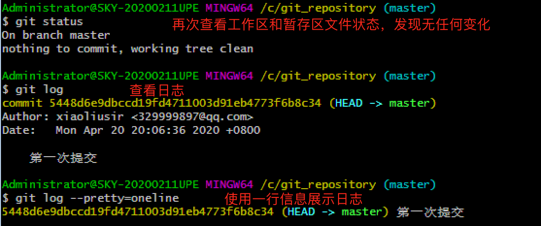 - 使用命令 git status 显示工作目录和暂存区的状态,发现无任何文件相关信息,因为暂存区的文件已提交,工作区无任何变化