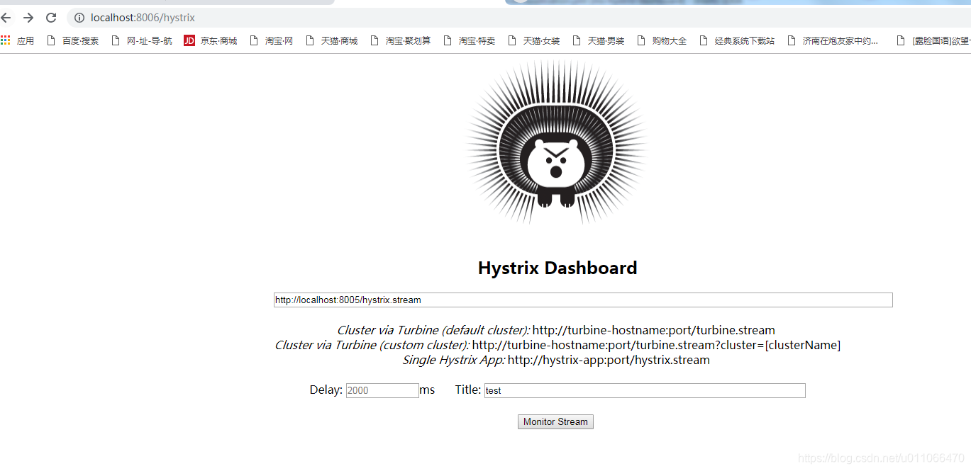 4、访问“http://localhost:2001/hystrix”,可以看到Dashboard主页面,输入要监控工程的hystrix.stream监控地址即可看到监控页面。