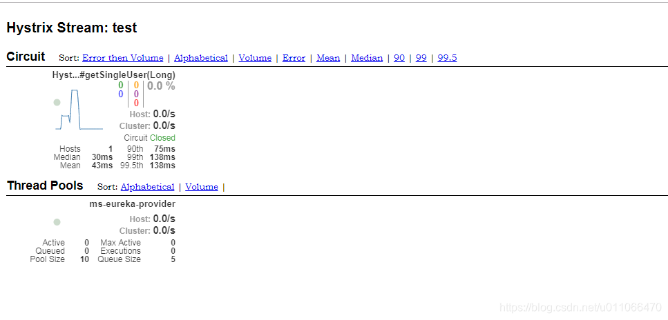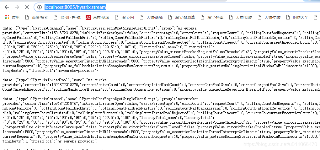 不停刷新:http://localhost:8005//hystrix-consumer/1 这个请求,可以看到下面两个页面不停的变化