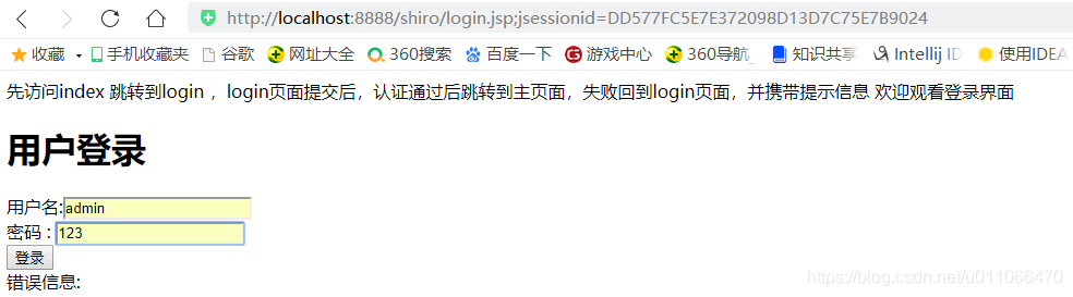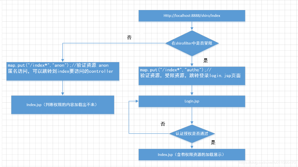 1.页面输入:http://localhost:8888/shiro/index 地址,走filter 因为设置/index*走验证,则跳转到login.jsp页面,所以: