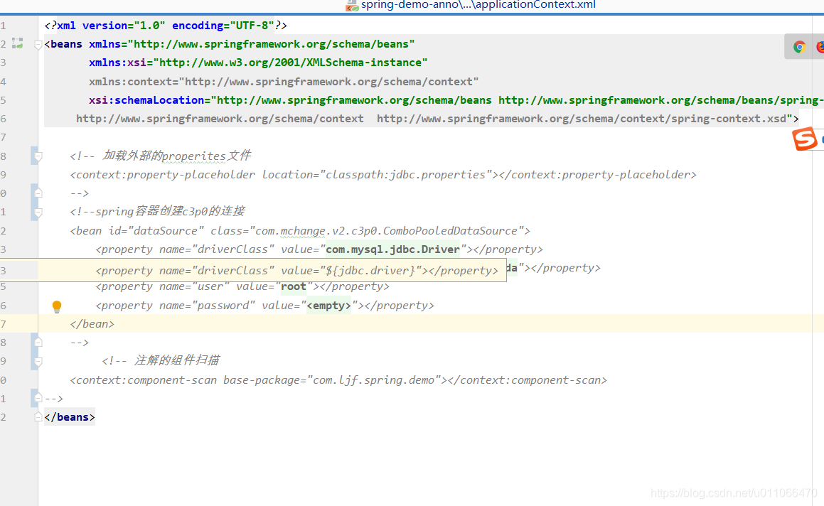 <property name="jdbcUrl" value="${jdbc.url}"></property>