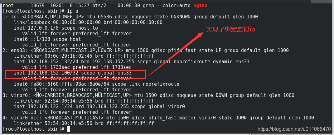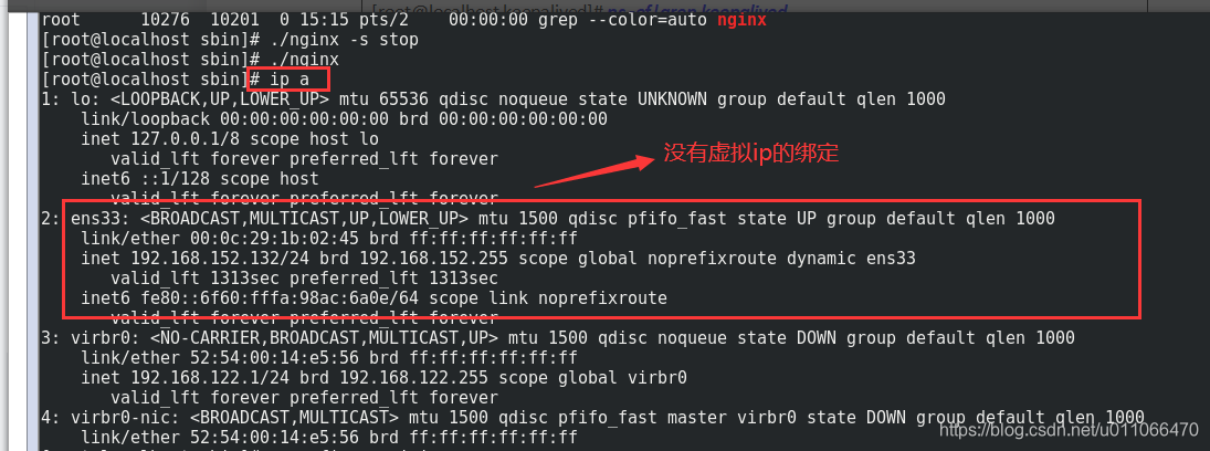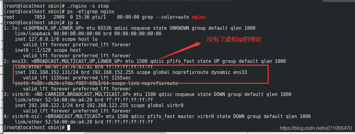 | [root@localhost sbin]# ./nginx -s stop [root@localhost sbin]# ps -ef|grep nginx root 7568 2909 0 15:18 pts/1 00:00:00 grep --color=auto nginx [root@localhost sbin]# systemctl stop keepalived.service |
