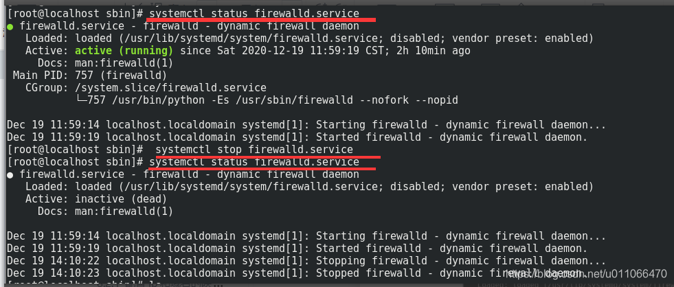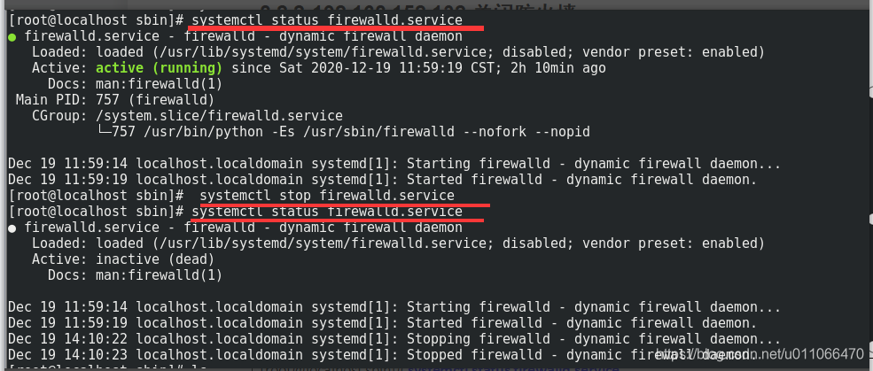 | [root@localhost sbin]# systemctl status firewalld.service ● firewalld.service - firewalld - dynamic firewall daemon Loaded: loaded (/usr/lib/systemd/system/firewalld.service; disabled; vendor preset: enabled) Active: active (running) since Sat 2020-12-19 11:59:19 CST; 2h 10min ago Docs: man:firewalld(1) Main PID: 757 (firewalld) CGroup: /system.slice/firewalld.service └─757 /usr/bin/python -Es /usr/sbin/firewalld --nofork --nopid Dec 19 11:59:14 localhost.localdomain systemd[1]: Starting firewalld - dynamic firewall daemon... Dec 19 11:59:19 localhost.localdomain systemd[1]: Started firewalld - dynamic firewall daemon. [root@localhost sbin]# systemctl stop firewalld.service [root@localhost sbin]# systemctl status firewalld.service ● firewalld.service - firewalld - dynamic firewall daemon Loaded: loaded (/usr/lib/systemd/system/firewalld.service; disabled; vendor preset: enabled) Active: inactive (dead) Docs: man:firewalld(1) Dec 19 11:59:14 localhost.localdomain systemd[1]: Starting firewalld - dynamic firewall daemon... Dec 19 11:59:19 localhost.localdomain systemd[1]: Started firewalld - dynamic firewall daemon. Dec 19 14:10:22 localhost.localdomain systemd[1]: Stopping firewalld - dynamic firewall daemon... Dec 19 14:10:23 localhost.localdomain systemd[1]: Stopped firewalld - dynamic firewall daemon. |