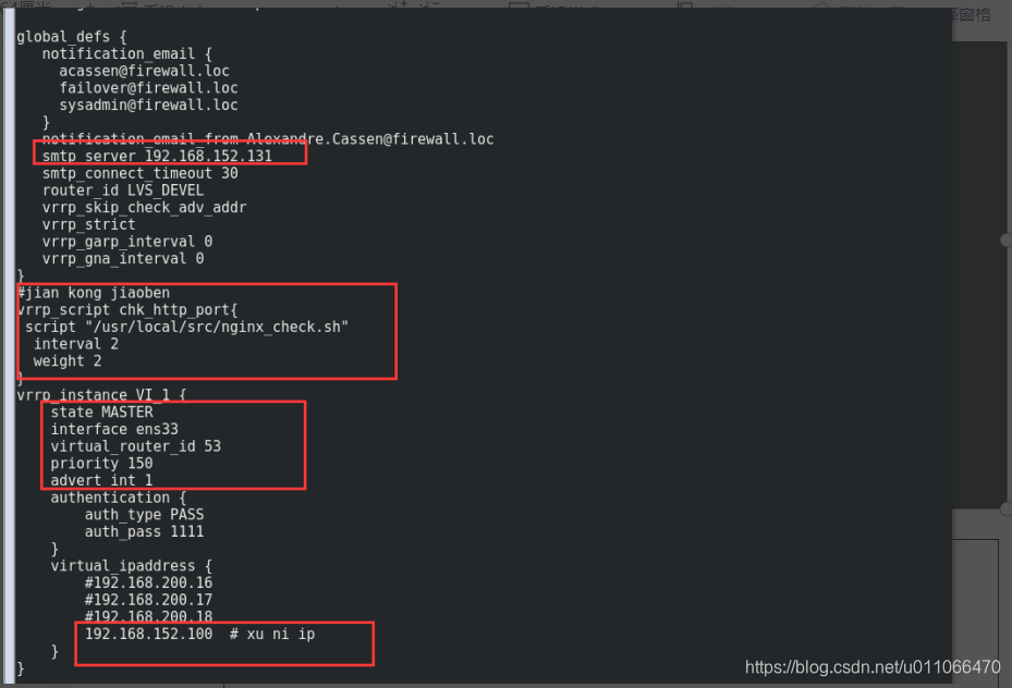 | #全局配置 global_defs { notification_email { acassen@firewall.loc failover@firewall.loc sysadmin@firewall.loc } notification_email_from Alexandre.Cassen@firewall.loc smtp_server 192.168.152.132 smtp_connect_timeout 30 router_id ww.xxjt.net #参考hosts文件的主机名 vrrp_skip_check_adv_addr vrrp_strict vrrp_garp_interval 0 vrrp_gna_interval 0 } #空脚本的配置 vrrp_script chk_http_port{ script "/usr/local/src/nginx_check.sh" interval 2 weight 2 } # vrrp_instance VI_1 { state BACKUP #备份服务器上将master 改为backup interface ens33 #网卡 virtual_router_id 53 #主、备机的virtual_router_id必须相同 priority 100 #主、备机取不同的优先级,主机值较大,备份机值较小 advert_int 1 authentication { auth_type PASS auth_pass 1111 } virtual_ipaddress { # 192.168.200.16 # 192.168.200.17 # 192.168.200.18 192.168.152.100 #虚拟ip } } |