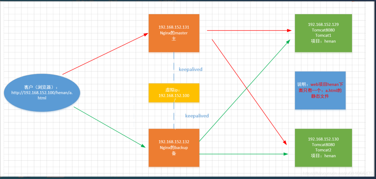 当用户通过浏览器访问代理服务器提供的地址:http://192.168.152.100/henan/a.html,当192.168.152.131为主服务的nginx挂掉之后,备份服务192.168.152.132的nginx仍可进行访问后面的web服务tomcat1和tomcat2。如果能够成功切换,则实现了nginx+keepalive的主从高可用功能。