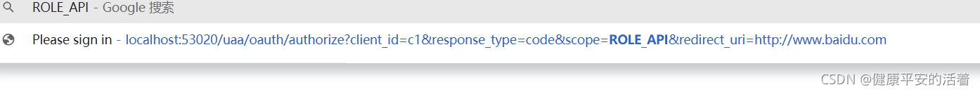 地址:http://localhost:53020/uaa/oauth/authorize?client_id=c1&response_type=code&scope=ROLE_API&redirect_uri=http://www.baidu.com