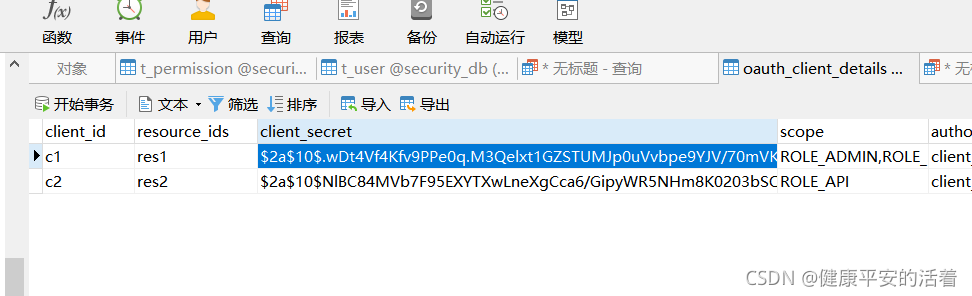DROP TABLE IF EXISTS `oauth_client_details`; CREATE TABLE `oauth_client_details` ( `client_id` varchar(255) CHARACTER SET utf8 COLLATE utf8_general_ci NOT NULL COMMENT '客户端标 识',`resource_ids` varchar(255) CHARACTER SET utf8 COLLATE utf8_general_ci NULL DEFAULT NULL COMMENT '接入资源列表', `client_secret` varchar(255) CHARACTER SET utf8 COLLATE utf8_general_ci NULL DEFAULT NULL COMMENT '客户端秘钥', `scope` varchar(255) CHARACTER SET utf8 COLLATE utf8_general_ci NULL DEFAULT NULL, `authorized_grant_types` varchar(255) CHARACTER SET utf8 COLLATE utf8_general_ci NULL DEFAULT NULL, `web_server_redirect_uri` varchar(255) CHARACTER SET utf8 COLLATE utf8_general_ci NULL DEFAULT NULL, `authorities` varchar(255) CHARACTER SET utf8 COLLATE utf8_general_ci NULL DEFAULT NULL, `access_token_validity` int(11) NULL DEFAULT NULL, `refresh_token_validity` int(11) NULL DEFAULT NULL, `additional_information` longtext CHARACTER SET utf8 COLLATE utf8_general_ci NULL, `create_time` timestamp(0) NOT NULL DEFAULT CURRENT_TIMESTAMP(0) ON UPDATE CURRENT_TIMESTAMP(0), `archived` tinyint(4) NULL DEFAULT NULL, `trusted` tinyint(4) NULL DEFAULT NULL, `autoapprove` varchar(255) CHARACTER SET utf8 COLLATE utf8_general_ci NULL DEFAULT NULL, PRIMARY KEY (`client_id`) USING BTREE ) ENGINE = InnoDB CHARACTER SET = utf8 COLLATE = utf8_general_ci COMMENT = '接入客户端信息' ROW_FORMAT = Dynamic; INSERT INTO `oauth_client_details` VALUES ('c1', 'res1', '$2a$10$NlBC84MVb7F95EXYTXwLneXgCca6/GipyWR5NHm8K0203bSQMLpvm', 'ROLE_ADMIN,ROLE_USER,ROLE_API', 'client_credentials,password,authorization_code,implicit,refresh_token', 'http://www.baidu.com', NULL, 7200, 259200, NULL, '2019‐09‐09 16:04:28', 0, 0, 'false'); INSERT INTO `oauth_client_details` VALUES ('c2', 'res2', '$2a$10$NlBC84MVb7F95EXYTXwLneXgCca6/GipyWR5NHm8K0203bSQMLpvm', 'ROLE_API', 'client_credentials,password,authorization_code,implicit,refresh_token', 'http://www.baidu.com', NULL, 31536000, 2592000, NULL, '2019‐09‐09 21:48:51', 0, 0, 'false');