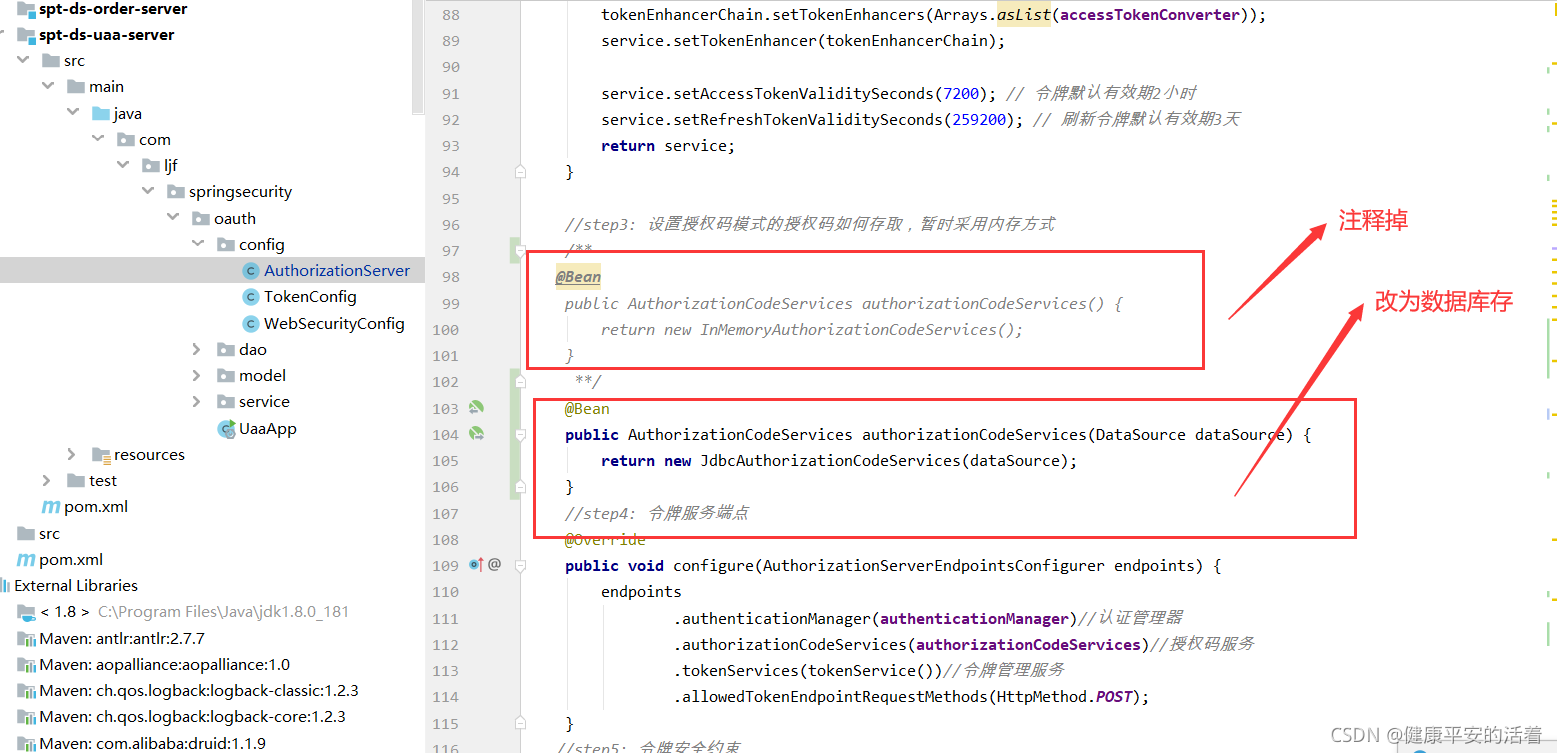 本文介绍了如何将OAuth客户端和授权码信息从内存迁移到数据库,包括创建`oauth_client_details`和`oauth_code`表,配置`AuthorizationServer`和使用JDBC服务。涉及配置ClientDetailsService、TokenStore和AuthorizationCodeServices,以及加密和验证过程。