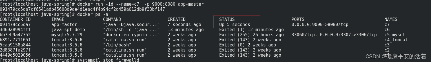 [root@localhost java-spring]# docker run -id --name=c7 -p 9000:8080 app-master