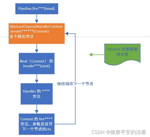 1.首先,当一个请求进来的时候,会第一个调用pipeline的相关方法,如果是入站事件,则这些方法都是fire开头,表示开始管道的流动,让后面的handler继续进行处 。