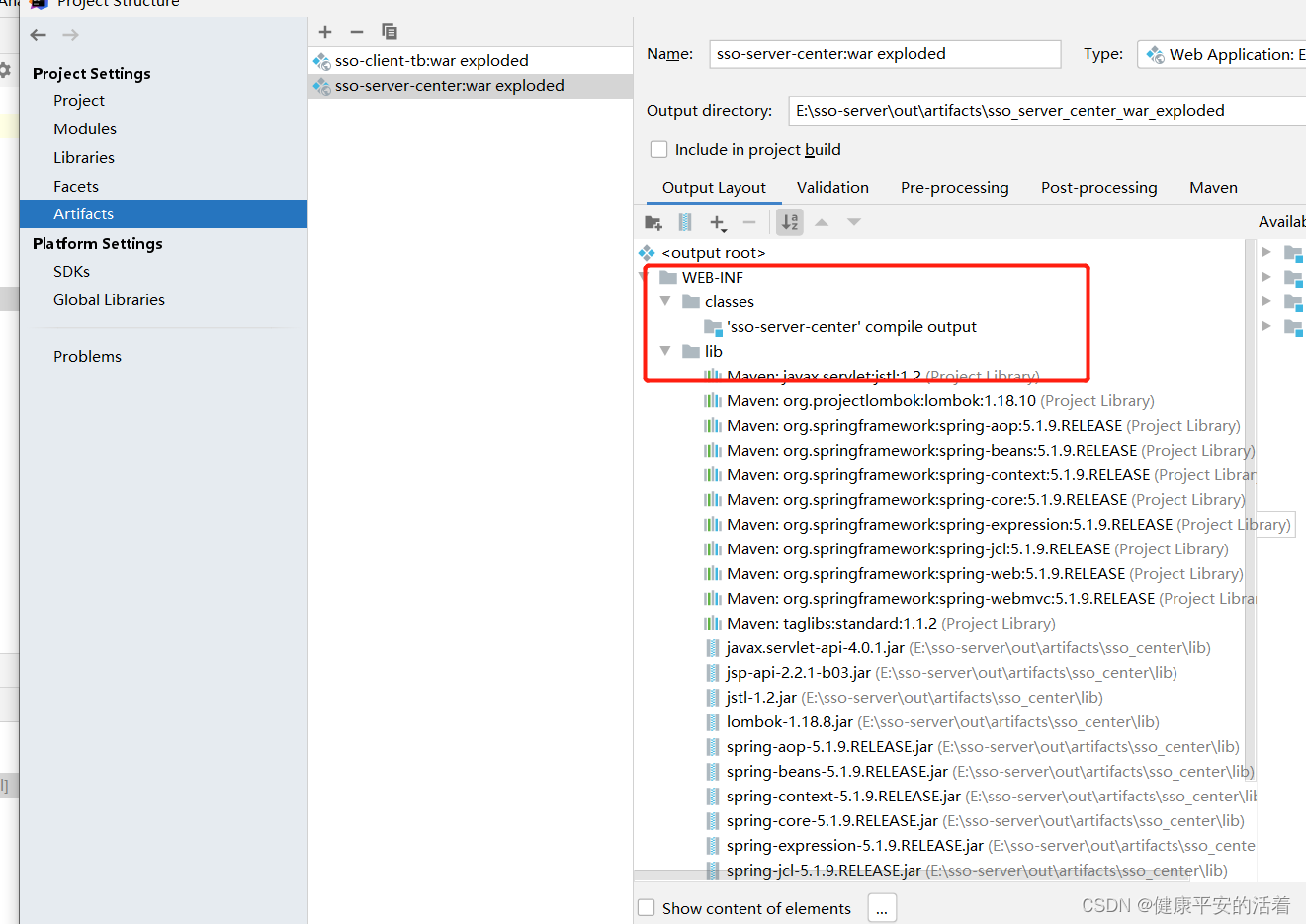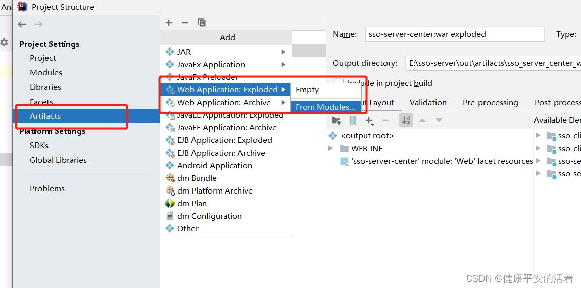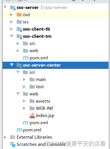 1.选择工程--》右键--》project structure --》modules ,可以看到sso-server-center没有web插件标志: