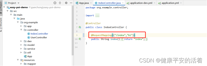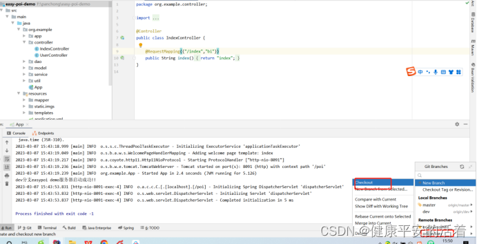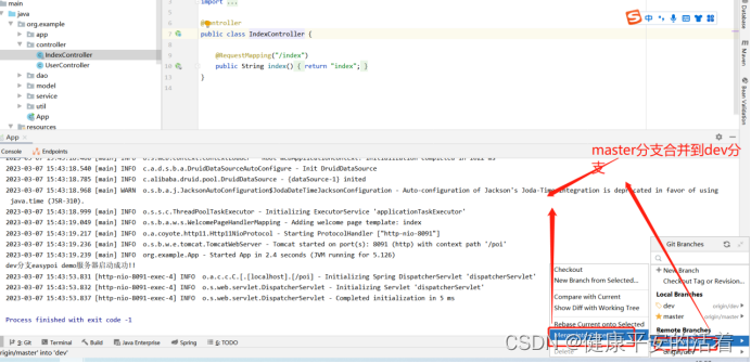 在master分支下,选中dev分支,执行merge into current。表达意思是,将dev分支合并到当前分支master下。
