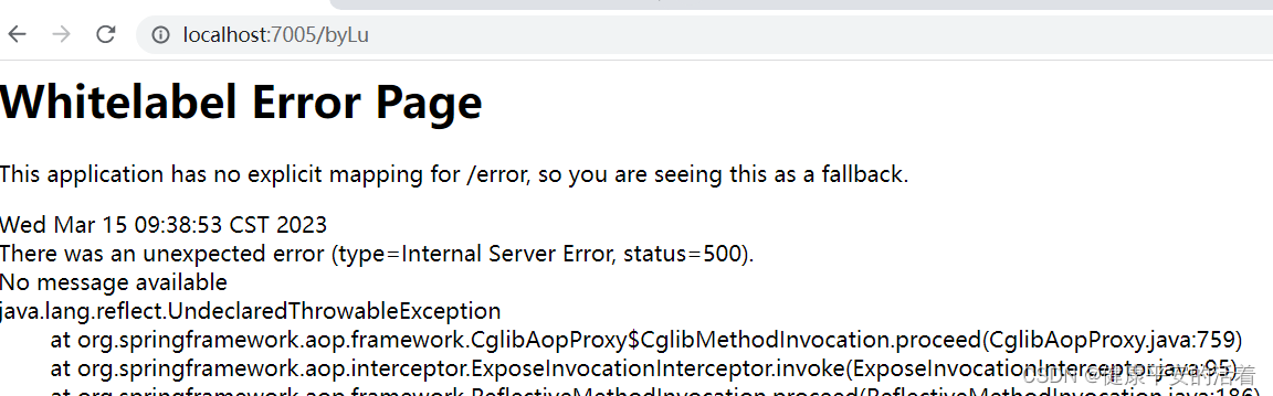 快速访问后触发限流规则,这里报空白页错误,是因为@sentinelResource注解没有配置blockhandler指定的处理方法。