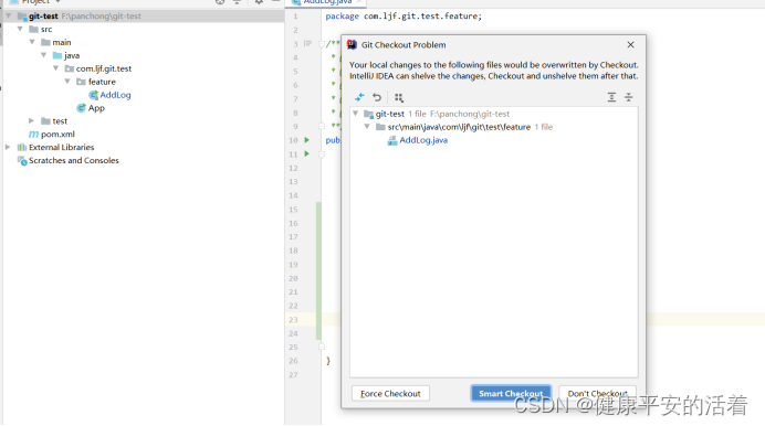 4.这次我们选择,默认force checkout,成功切换到ljf_dev,可以看到,dev分支修改内容没有带过来