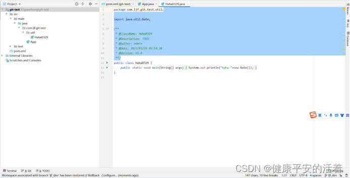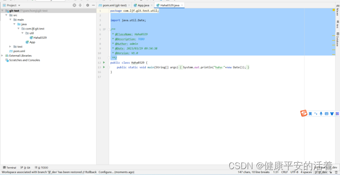 5.现在在ljf_dev分支查看:看到dev分支修改的内容,并没有带过来