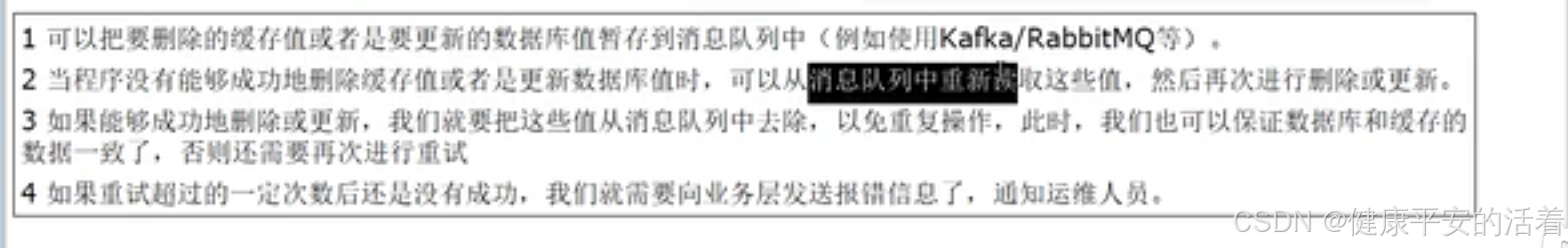 我们可以对已存入缓存的数据设置过期时间,所有的写操作以数据库为准,对缓存的操作只是尽最大努力即可。也就是说数据库写成功,缓存更新失败,只要达到过期时间,后面的读请求自然会从数据库中读取最新值,然后回填缓存,达到一致性。一定注意,要以mysql的数据库的写入为准。