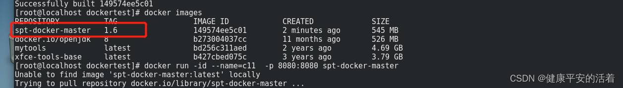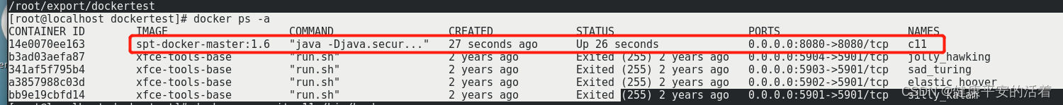 [root@localhost dockertest]# docker run -id --name=c11 -p 8080:8080 spt-docker-master:1.6