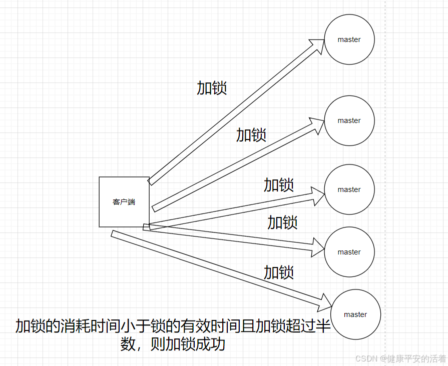 注意图中所有的节点都是master节点。加锁的消耗时间小于有效时间且加锁超过半数成功,就认为是成功。