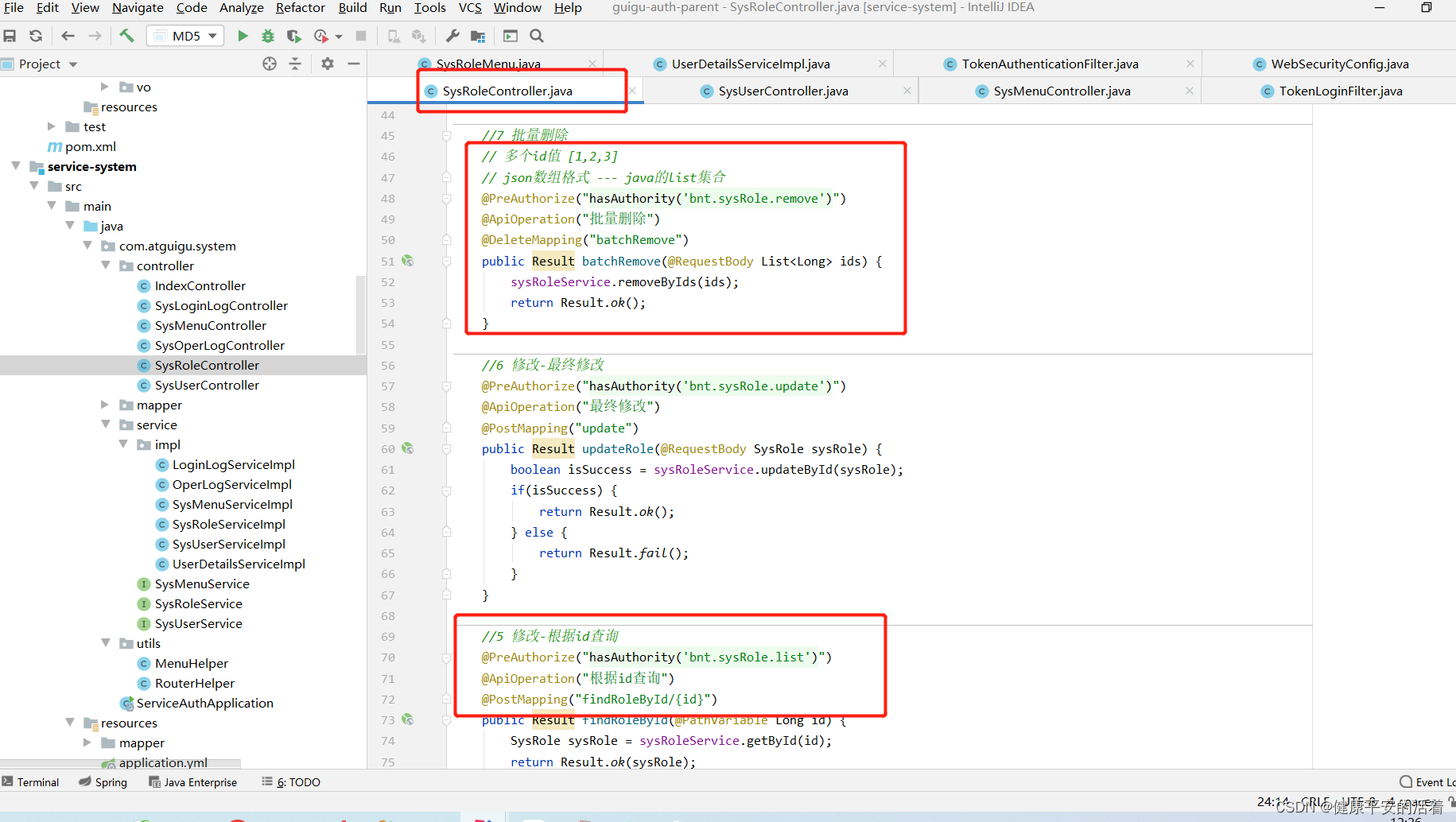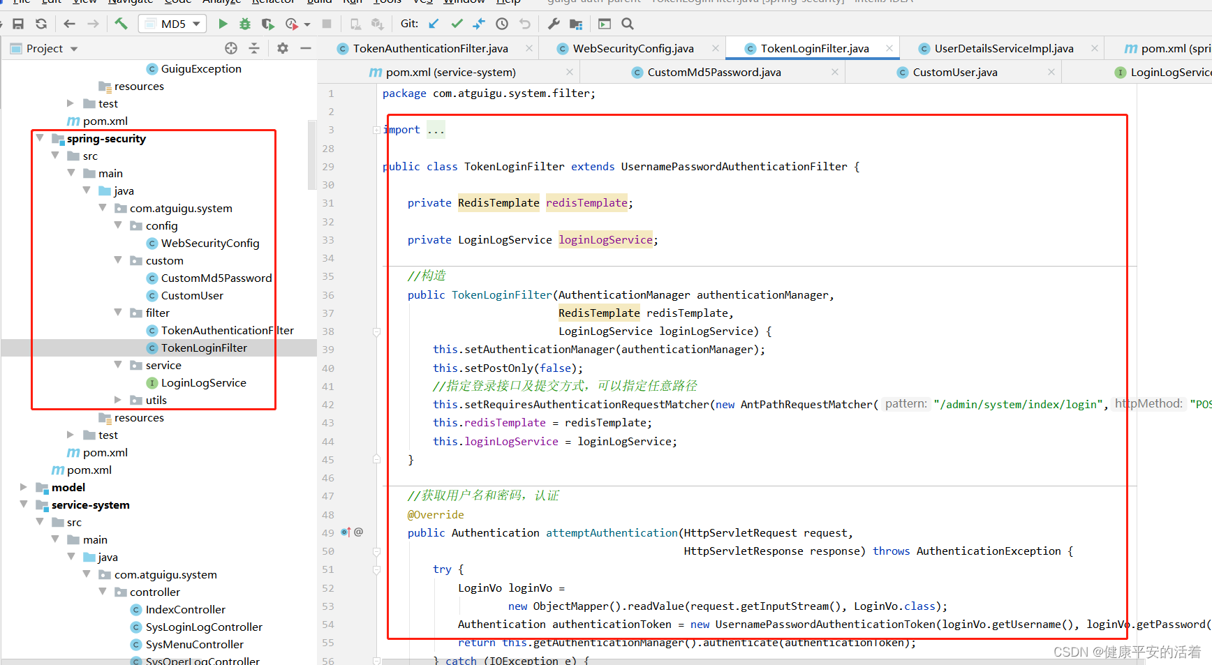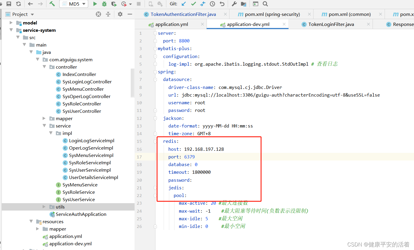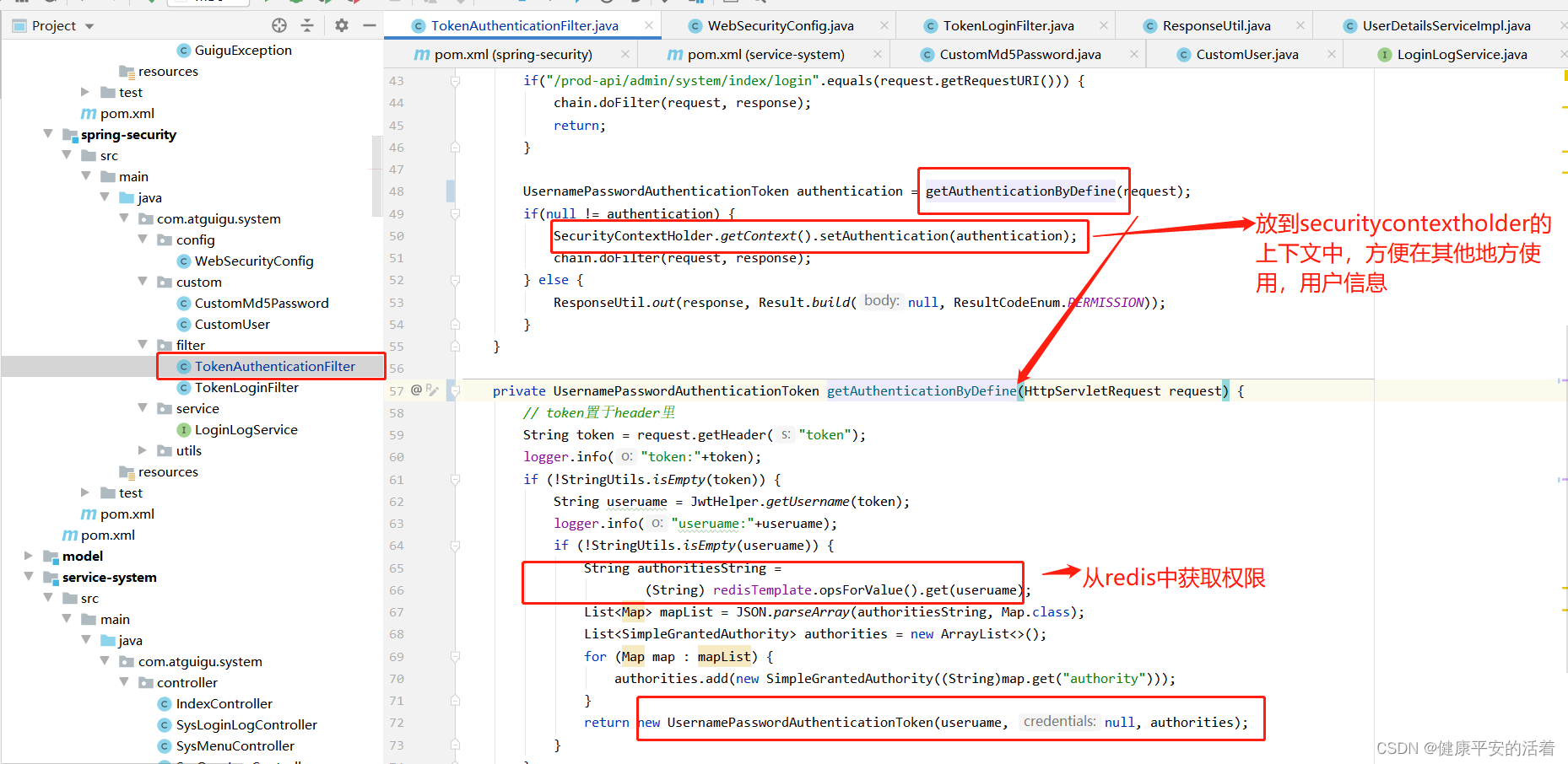 3.在TokenAuthenticationFilter验证解析过滤器中,通过用户名从redis中获取对应的用户权限信息。