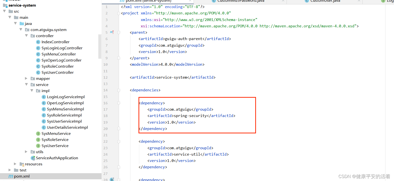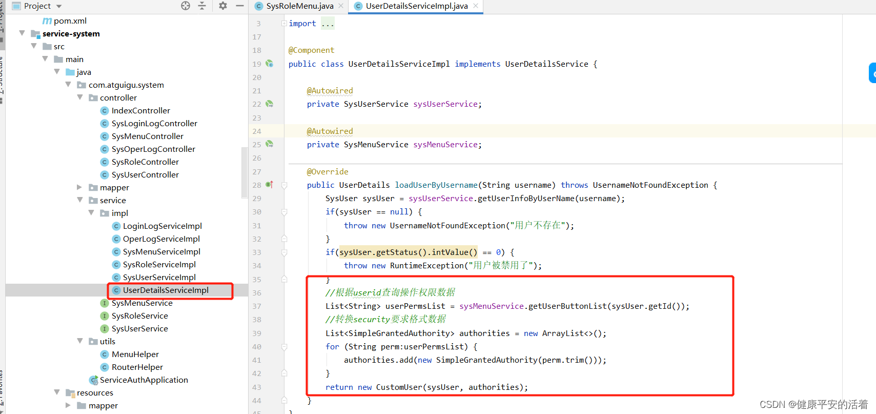 2.我们需要自定义自己的业务逻辑实现:通过用户名查询用户信息。写在service-system模块中。