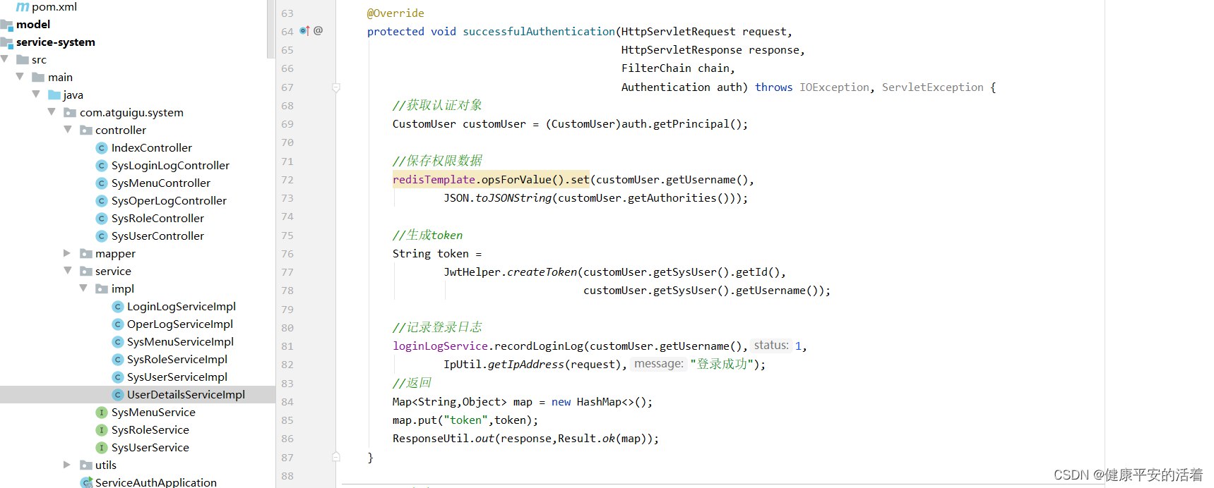 3.1如果验证合法返回到TokenLoginFilter类中success方法中进行后面操作,