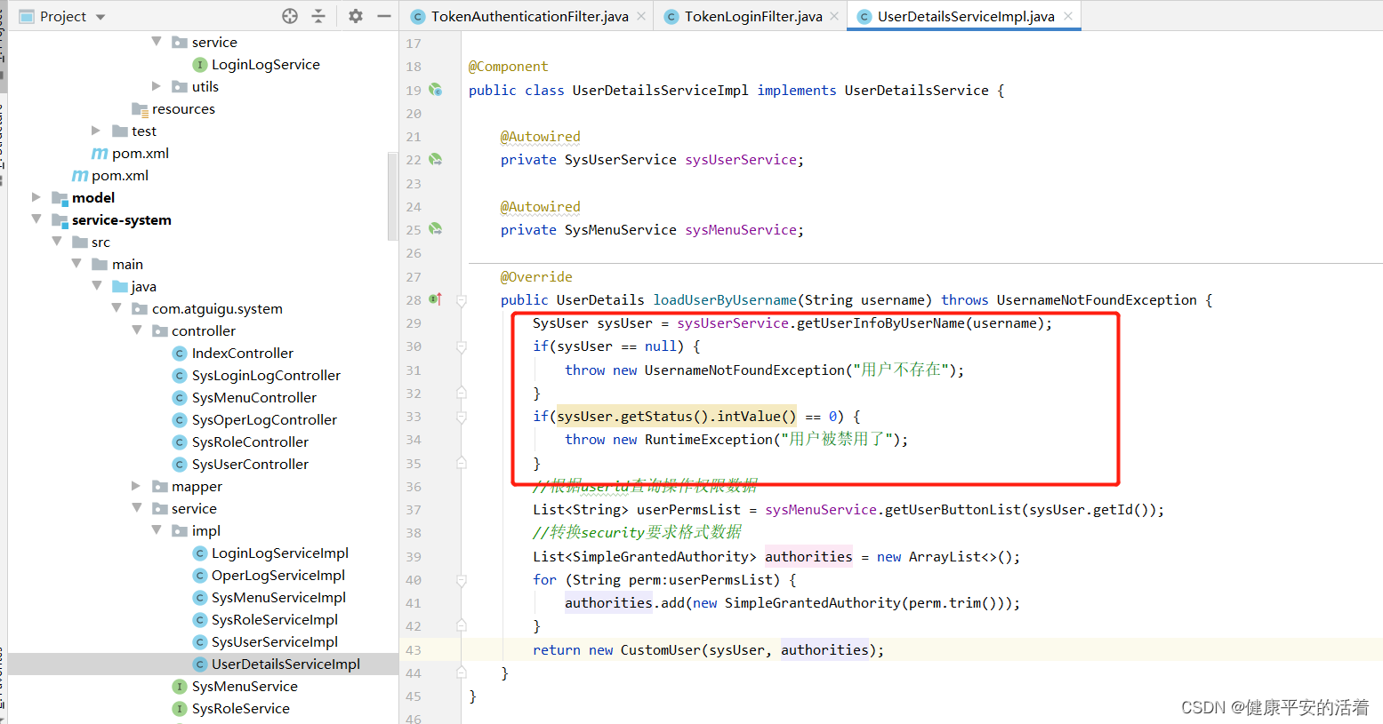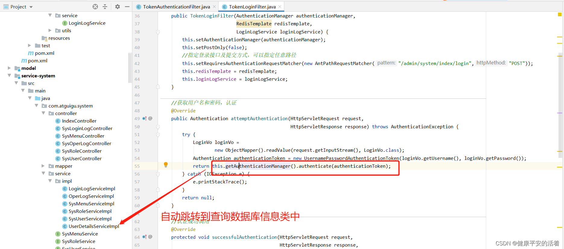 3.最后执行 UserDetailsServiceImpl(具体模块中查询用户名和密码,权限等信息)