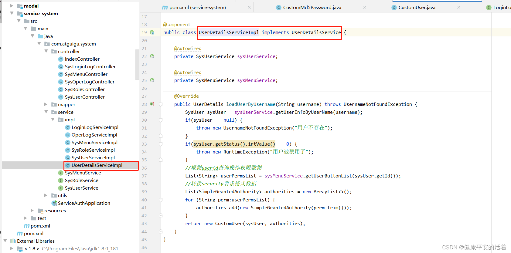 自定义用户查询用信息实现类,需要实现UserDetailsService接口