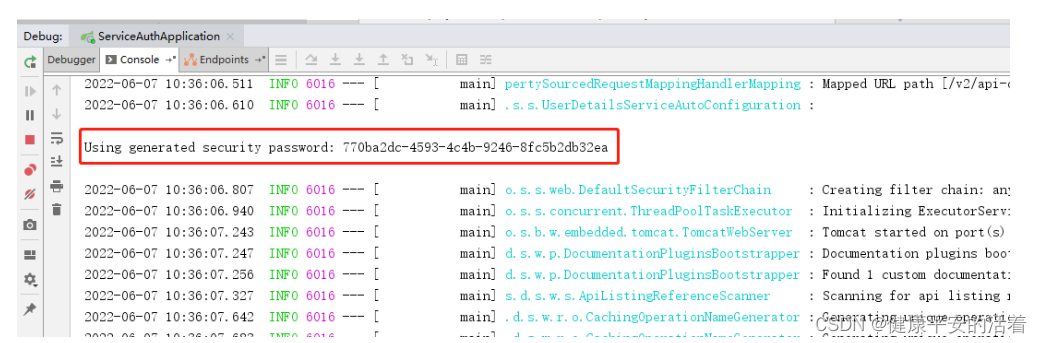 密码在项目启动的时候在控制台会打印,注意每次启动的时候密码都会发生变化!